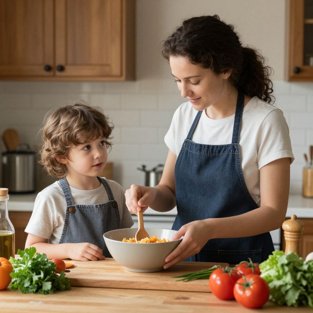 Two individuals, a woman and a child, are engaged in cooking together in a cozy kitchen setting, with the woman stirring a bowl of food while the child observes attentively, surrounded by fresh ingredients on a wooden cutting board.