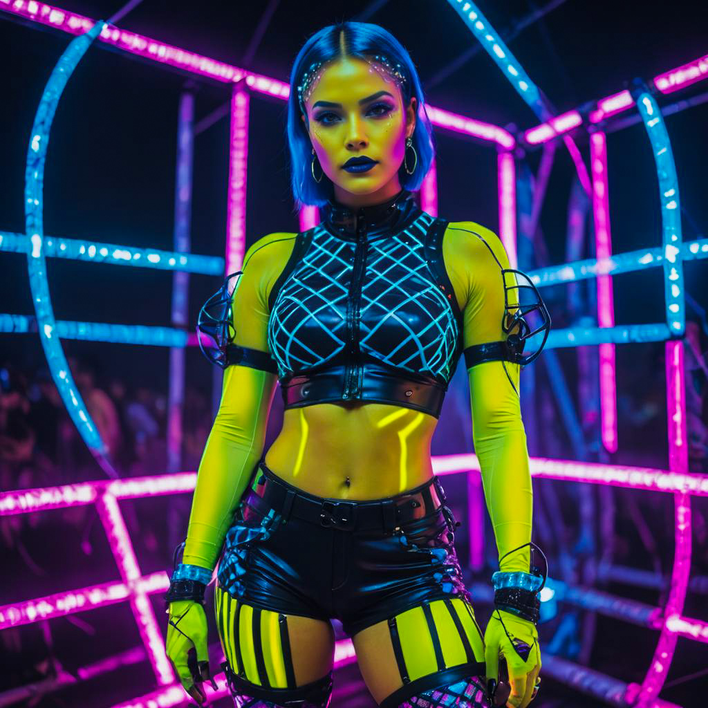 Photo of an Athletic Build woman, Pompadour, rave outfit, neon colors, reflective materials, mesh sports bra, custom graphic trembles, high-top performance trainers, LED accessories, cyberpunk style, bold patterns, vibrant makeup, Laser Lime Polyester, under the electric while ceiling, vibrant premier grain