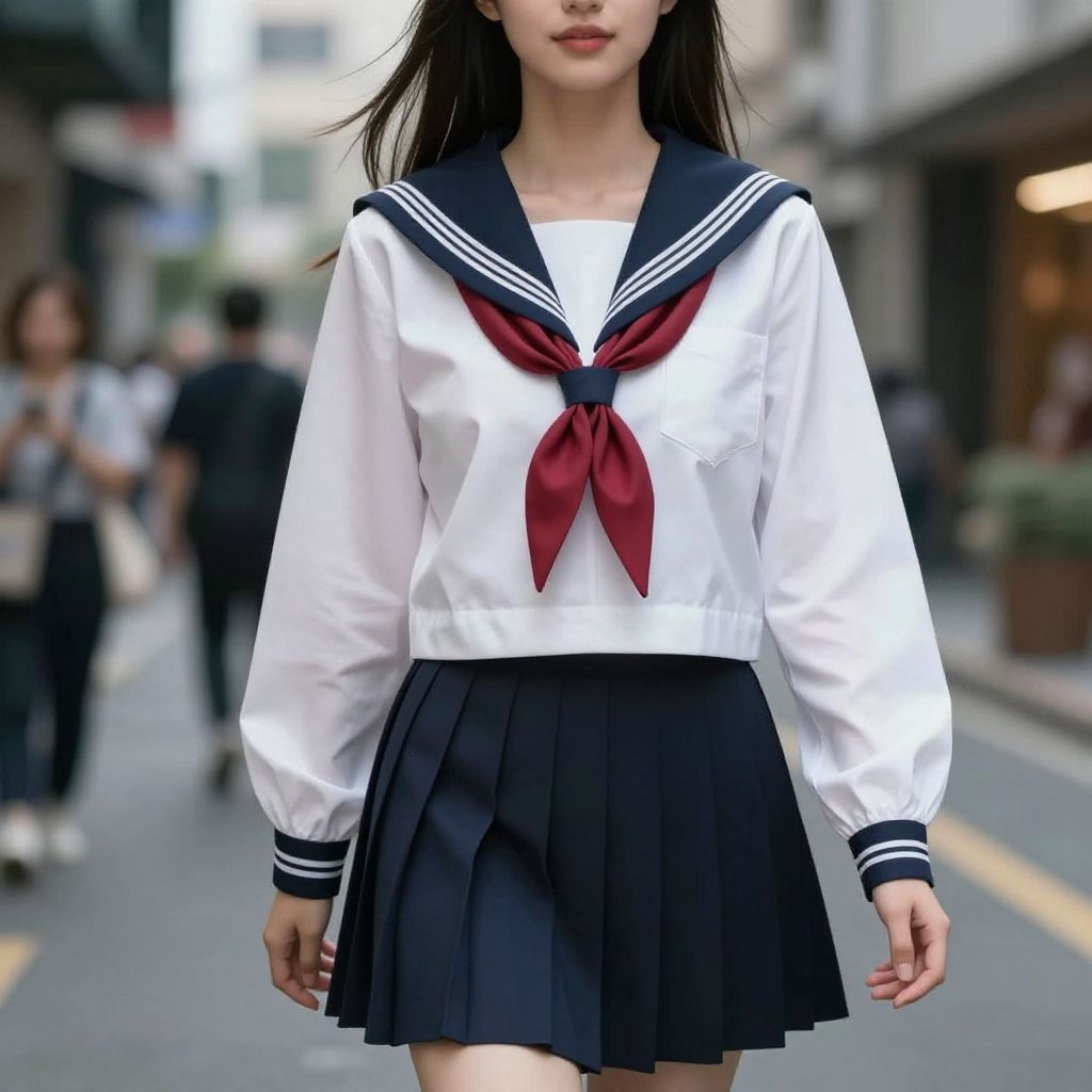 Photograph of an Asian woman with long black hair, wearing a traditional Japanese schoolgirl uniform. The outfit includes a white, long-sleeved blouse with a navy blue sailor collar and a large red necktie. She also wears a black pleated skirt. The background is a blurred urban street scene with other pedestrians and buildings. The image focuses on her from the waist up, with the background slightly out of focus to emphasize her attire. The overall style is realistic with a sharp focus on the subject and a soft blur for the background.