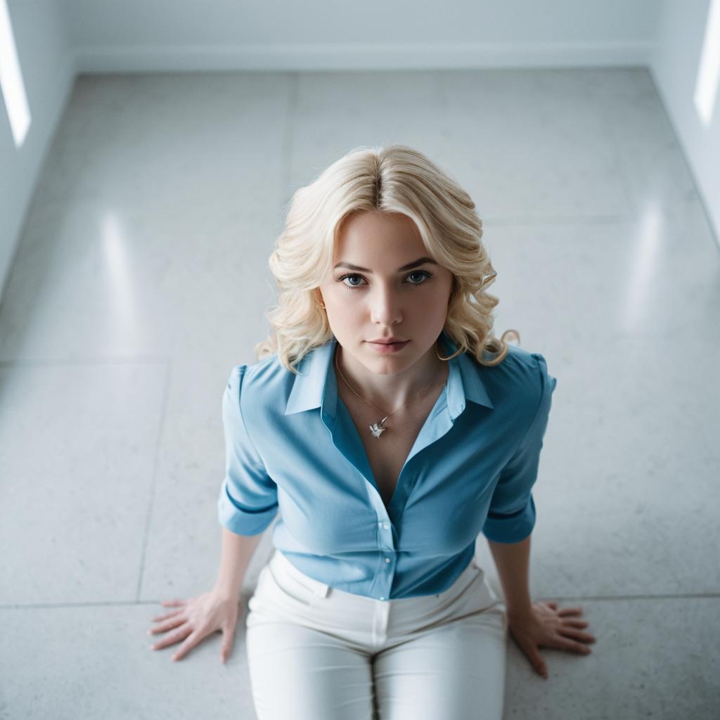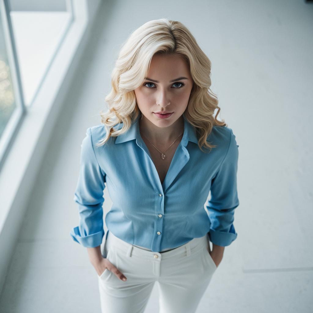 Sexy Marion cosplay outfit, Home Madeleine Budd, blonde medium-length wavy hair, form-fitting light blue blouse, sleek white trousers, subtle minimalist jewelry, sexy cosplay pose, cinematic lighting, overhead shot, bokeh, minimalist background