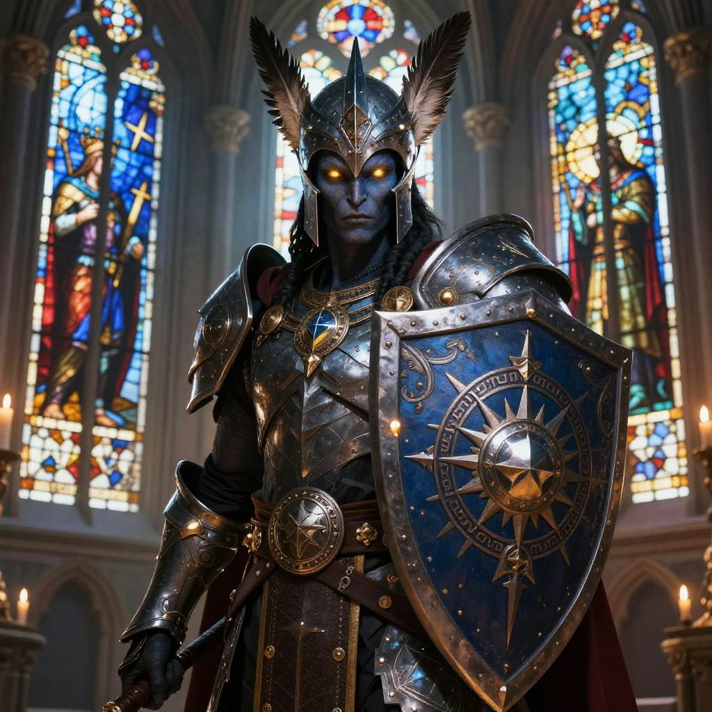 Digital artwork of a dark blue-skinned, glowing-eyed armored warrior with feathered helmet, holding a star-embossed shield, in a Gothic cathedral