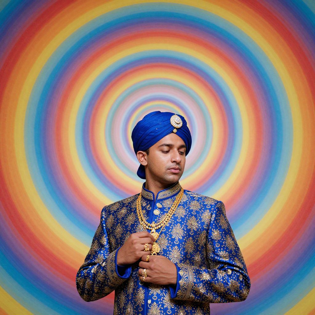 A hyper-realistic portrait of a young man with brown skin, taken from a low angle with the camera at floor level, capturing his upper body as he gazes contemplatively downward, He wears a vibrant blue Sherwani adorned with intricate golden motifs, each pattern accentuating the luxurious texture of his attire, His look is complemented by ornate gold accessories: a majestic necklace, detailed rings, and a traditional turban set with a sparkling brooch, enhancing his dignified appearance, Behind him, a surreal background of concentric circles draws the eye—each layer is a distinct, vivid color, beginning with a large outer circle and progressing through smaller circles until reaching a single, central point, This kaleidoscope of colored circles creates a mesmerizing contrast that highlights the rich blue of his Sherwani, giving the entire scene a dreamlike quality, The harmonious blend of the intricate patterns in his clothing with the concentric circles in the background transforms the portrait into a captivating fusion of elegance and surrealism