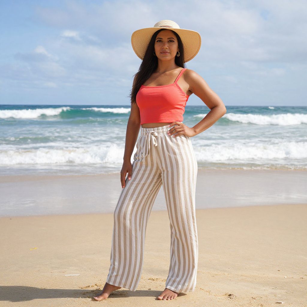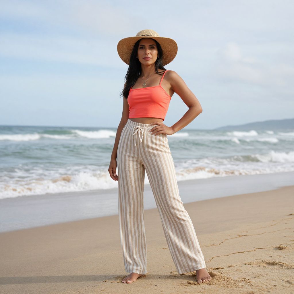 Woman standing confidently on a sandy beach, wearing a wide-brimmed straw hat, a vibrant coral crop top, and striped beige pants, with her hand resting on her hip as gentle waves roll behind her under a partly cloudy sky.