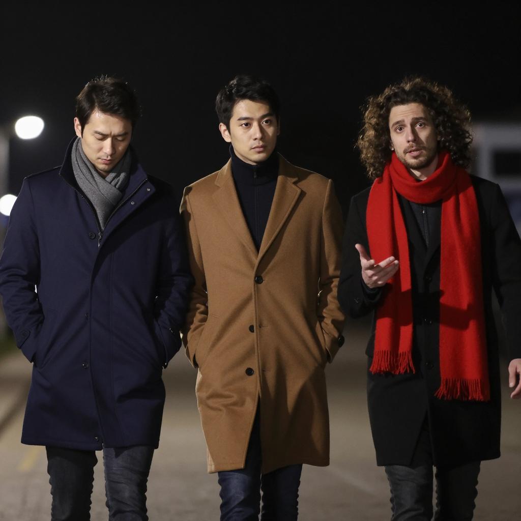 Three men walking outdoors at night. The man on the left wears a blue coat and gray scarf, looking down. The middle man in a brown coat looks forward. The right man with long curly hair, black coat, and red scarf gestures with his right hand. Background is dark with blurred lights.