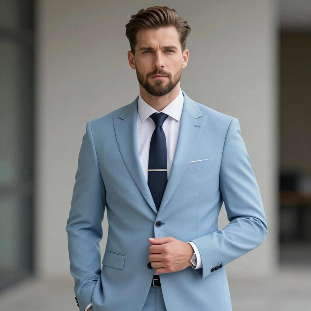 A dapper man stands confidently in a tailored light blue suit, showcasing a sophisticated style. His neatly styled hair and well-groomed beard complement the elegant attire, suggesting professionalism and charisma, ideal for corporate or formal contexts.