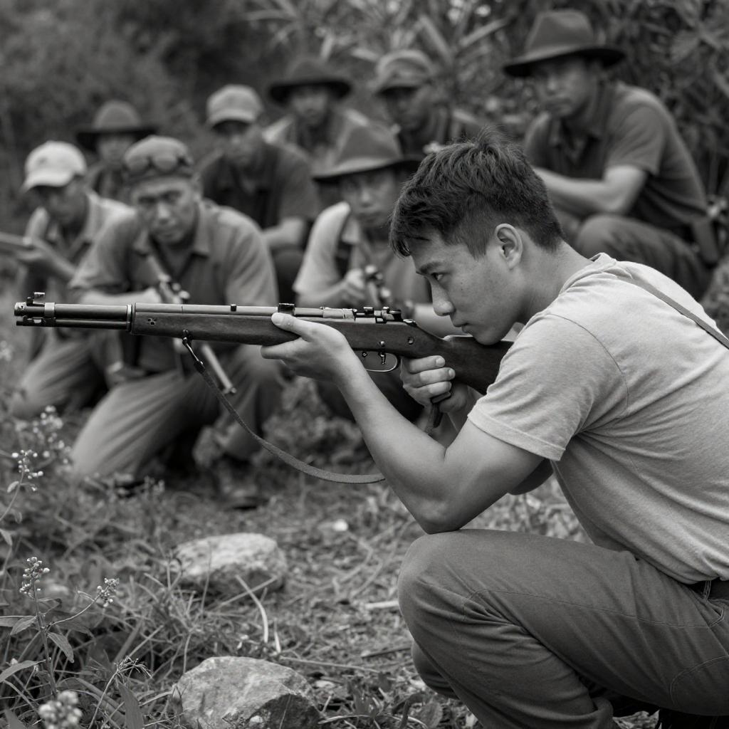 Black-and-white photograph. Foreground: man with rifle, crouching, aiming. Background: group of men in hats, crouching, hiding. Dense foliage. Man in foreground, dark hair, side view, intense focus. Background men, varied hats, visible rifles, serious expressions. Textured ground, scattered rocks, vegetation. Midground: another man, rifle, crouching, focused.