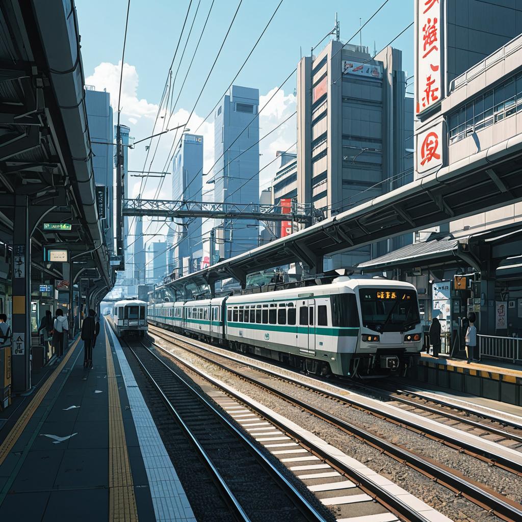 Digital painting of a detailed anime-style train station platform with modern trains and a skyline of high-rise buildings in the background. The scene is inspired by Tokyo, featuring intricate and elegant design elements with cyberpunk and sci-fi influences. The image exhibits beautiful lighting and shadow effects, capturing a serene moment at the train station with a few passengers waiting. The art style resembles works by Makoto Shinkai, Greg Rutkowski, and other renowned illustrators.