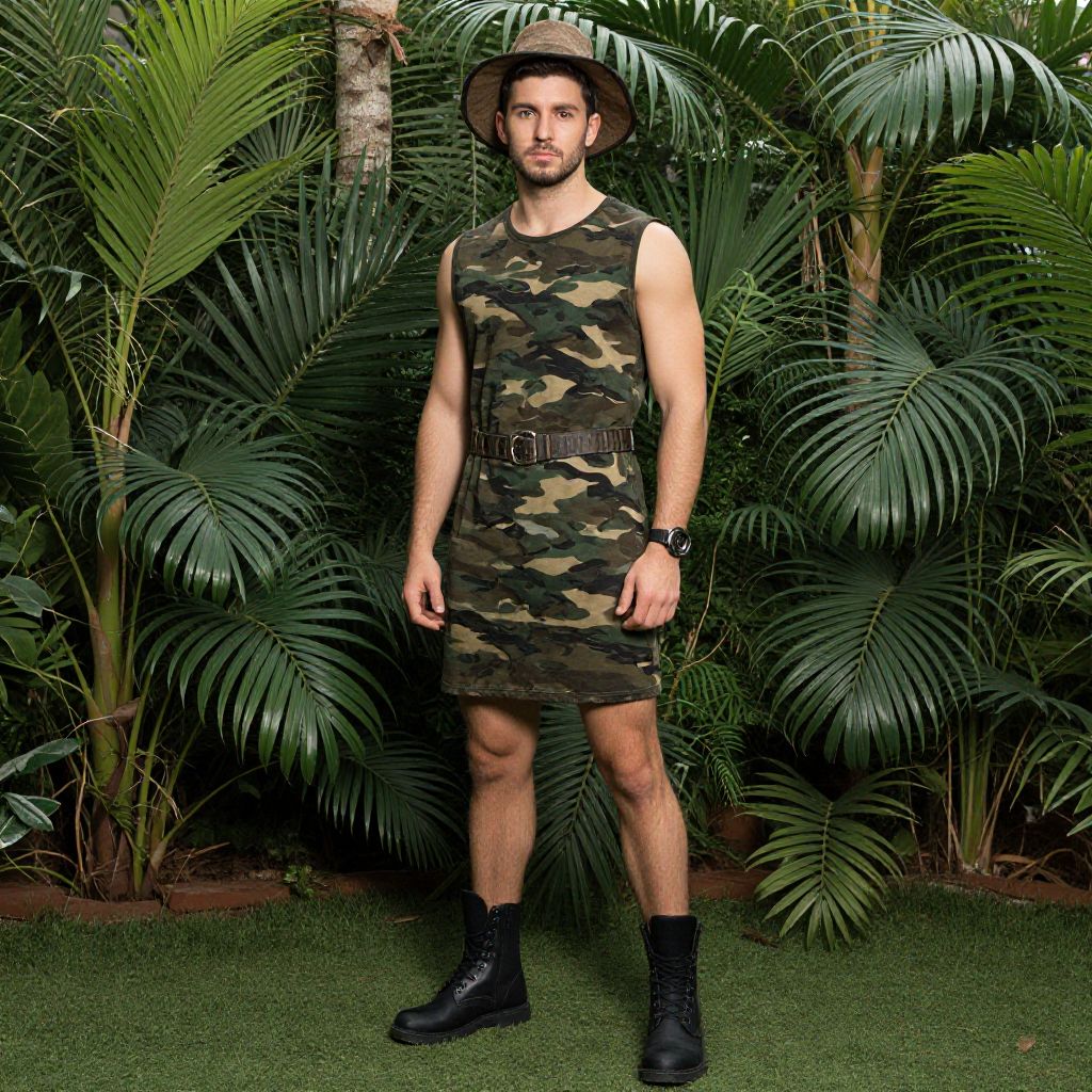"jungle theme party dress, 1boy, solo, male focus, boots, watch, tree, hat, camouflage, wristwatch, belt, palm tree, facial hair, realistic, jungle, full body Realistic photo of casual sexy person with pretty face"