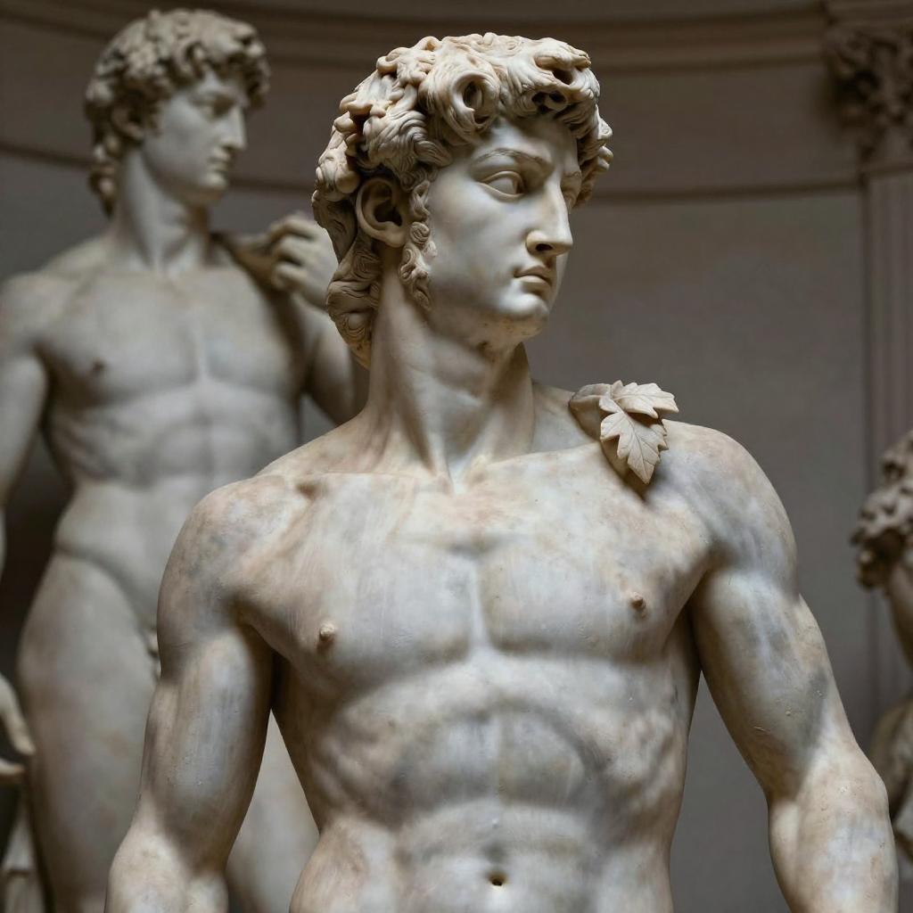 Photograph of a highly detailed, realistic sculpture of a muscular, bearded man with wavy hair, inspired by classical Greek art. He has a strong, defined jawline and a serious expression. His bare chest and abs are prominently displayed, with a leaf on his right shoulder. The background is blurred, featuring another similar sculpture. The lighting creates a dramatic, shadowy effect, highlighting the sculpture's textures and contours.
