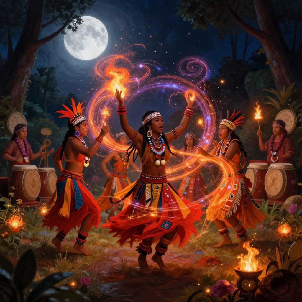 Photograph of a nighttime forest scene featuring six indigenous dancers adorned in traditional, colorful attire with feathered headdresses and beaded necklaces. The central dancer, with dark skin and muscular build, holds a flaming torch in each hand, creating swirling, glowing orange and red trails. Other dancers, also with dark skin, stand in a semi-circle with drums. A full moon illuminates the background, surrounded by dark trees and subtle starlight. Small fires and glowing embers are scattered on the forest floor, adding to the mystical ambiance. The image is vibrant, dynamic, and richly textured.