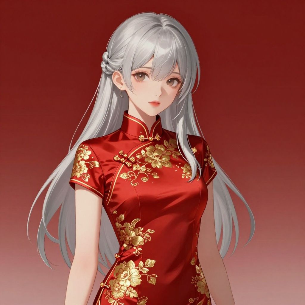 Digital anime-style illustration of a young woman with long, silver-white hair and gray eyes. She wears a traditional, red, high-collared qipao adorned with intricate gold floral patterns. Her hair is neatly braided at the crown, and she has a subtle, confident smile. The background is a gradient from dark red to light red, enhancing the vividness of her outfit. The illustration is highly detailed, with smooth, polished textures and a focus on her elegant, serene expression.