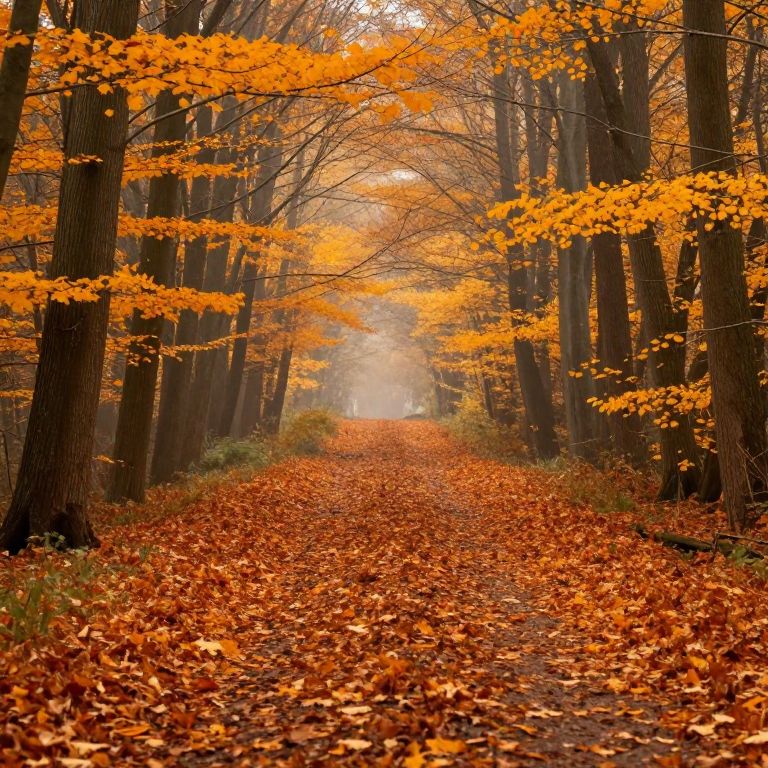 Autumn's golden embrace envelops a serene forest path, where vibrant orange leaves cascade onto the ground, creating a warm, inviting carpet that stretches into the misty distance under the towering trees.
