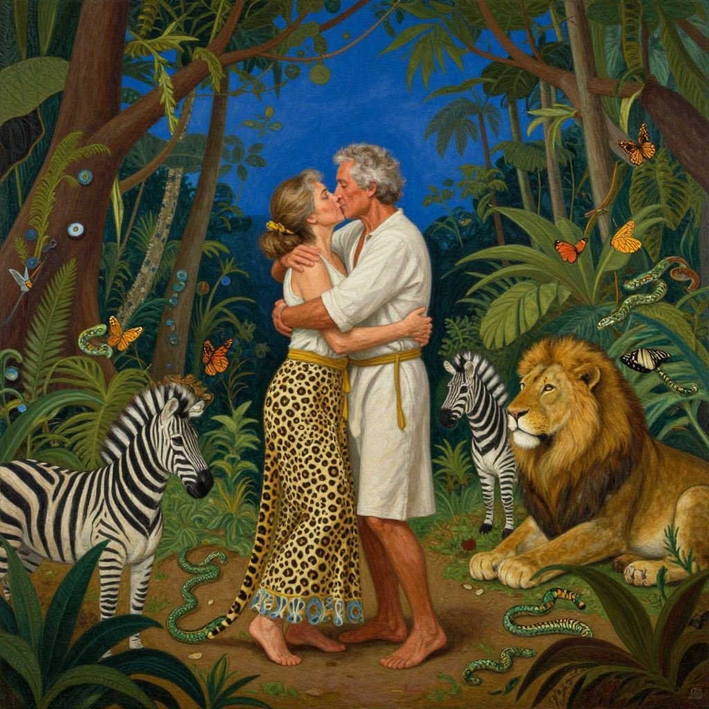 A vibrant, Rumi-inspired, Rousseau-style painting depicts a man and woman in their 60s embracing passionately in a lush jungle, surrounded by exotic animals like leopards, lions, zebras, snakes, and butterflies, with a deep blue sky and fertile earth, evoking a sense of love and fertility.