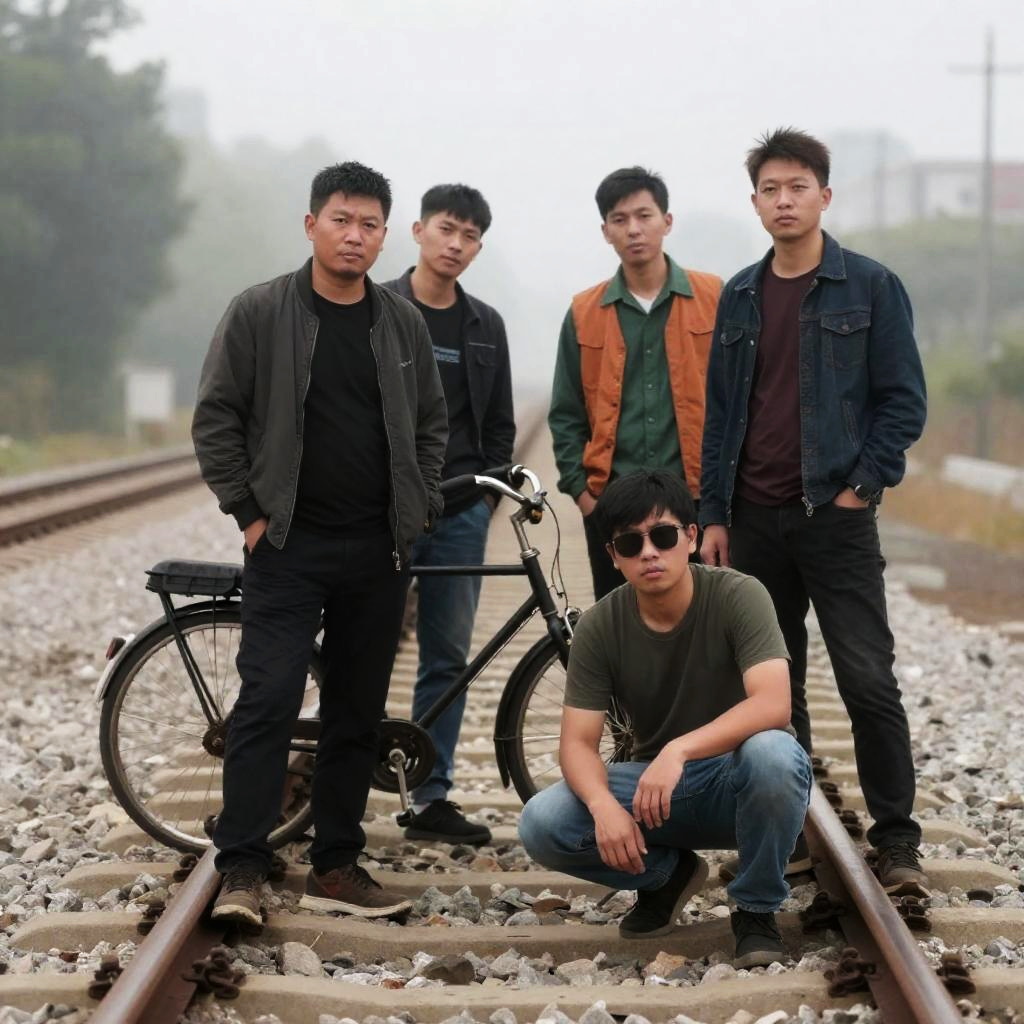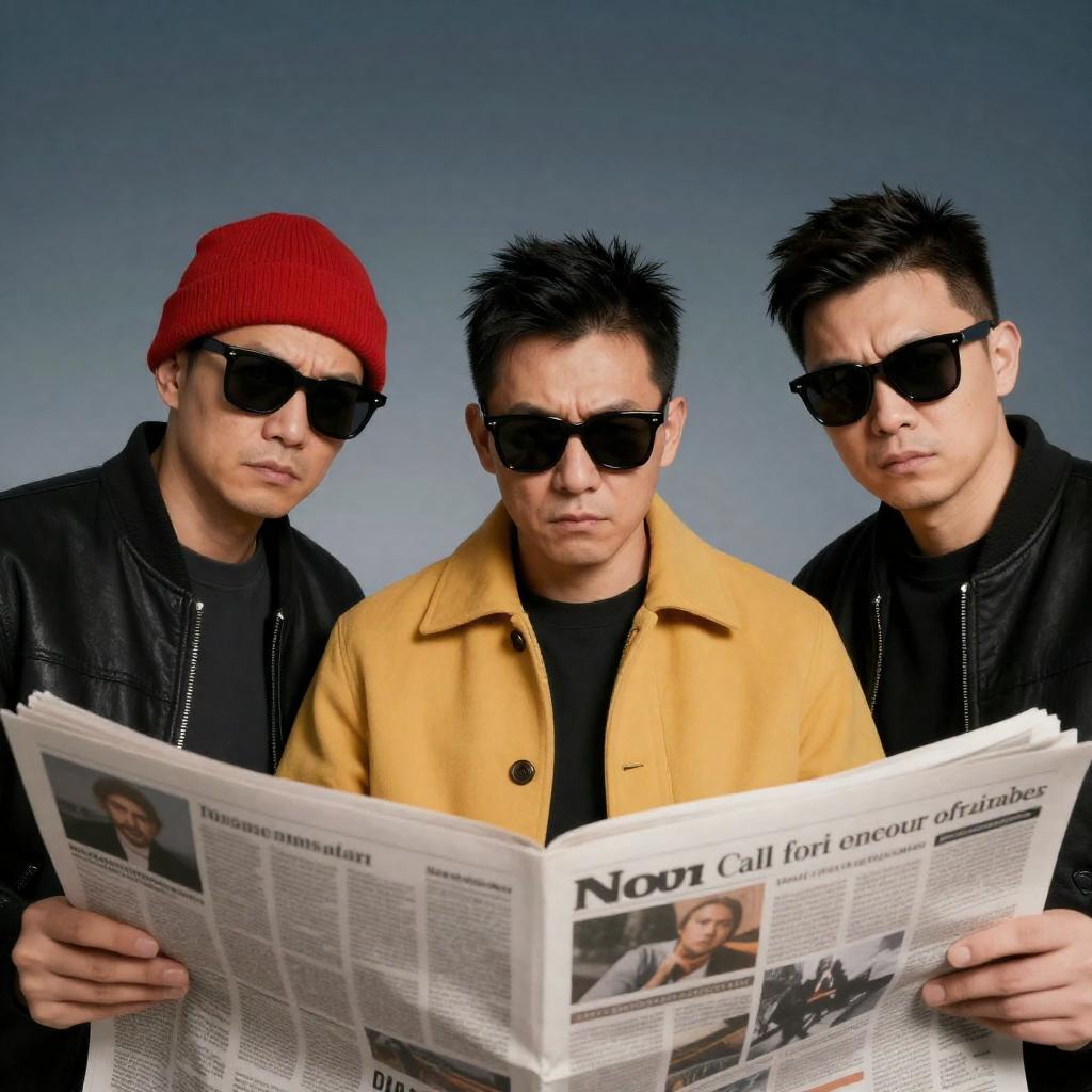 Four male Asian musicians performing live on stage with red and blue lighting. Three members wear casual outfits: two in white t-shirts with jeans and black pants, one in a red t-shirt with black pants. The lead singer on the right is seated on a speaker, dressed in a blue jacket, white t-shirt, and matching blue pants. A drum set and microphone stands are visible in the background, highlighting the energetic rock band setup.