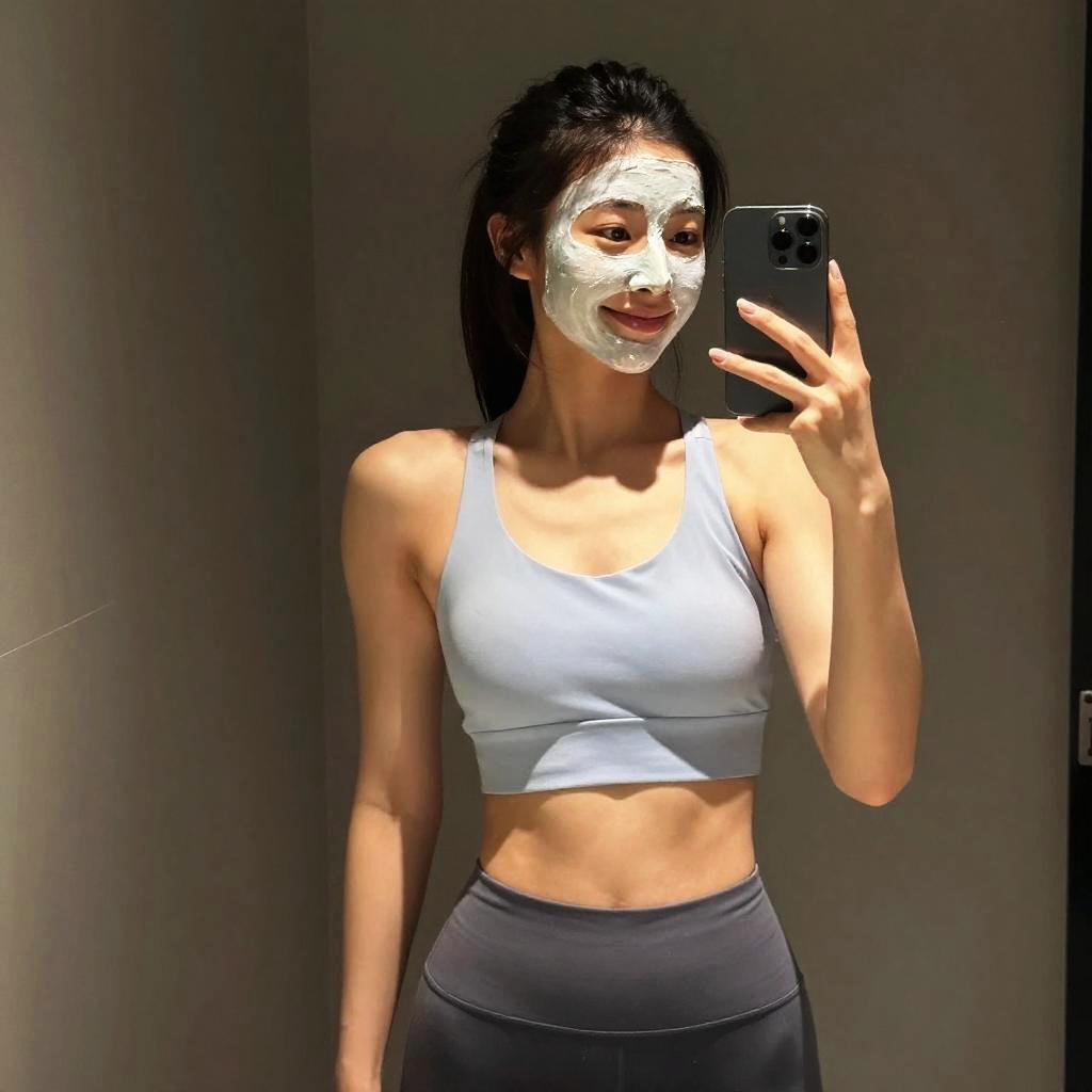 Photograph of an Asian woman with medium skin tone and black hair in a ponytail, taking a mirror selfie. She wears a white face mask with a white pattern, a white sports bra showing her toned midriff, and dark gray leggings. Her right hand holds a black smartphone, and she smiles slightly. The background is a plain, dark gray wall with soft lighting highlighting her face and upper body. The image has a slightly grainy texture and is digitally edited.