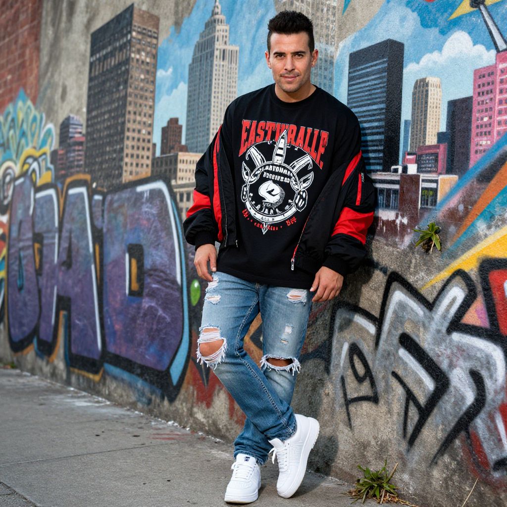 A man, oversized graphic tee, distressed denim jeans, chunky white sneakers, bomber jacket, black and red color scheme, concrete jungle skyline, vibrant murals, eastman llp film stock, leaning against a graffiti wall, confident smile.Man has masculine face and piercing eyes