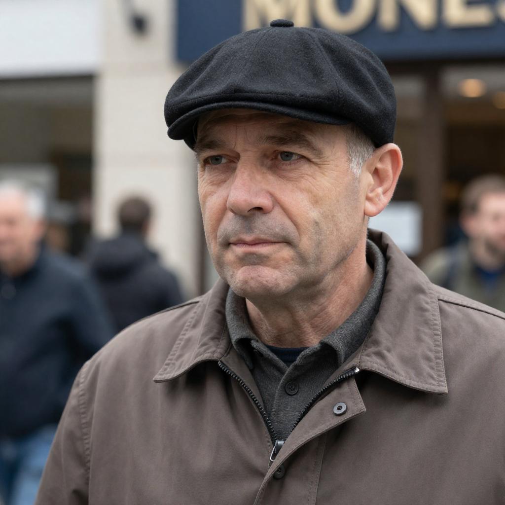 Photograph of a middle-aged man with fair skin, wearing a black flat cap and brown jacket, looking slightly to the side with a neutral expression. Background includes blurred people and a storefront with signs. Daylight setting.