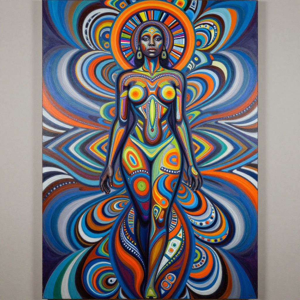 Vibrant, psychedelic painting of a nude, dark-skinned woman with glowing orange and yellow accents, surrounded by swirling, colorful patterns.