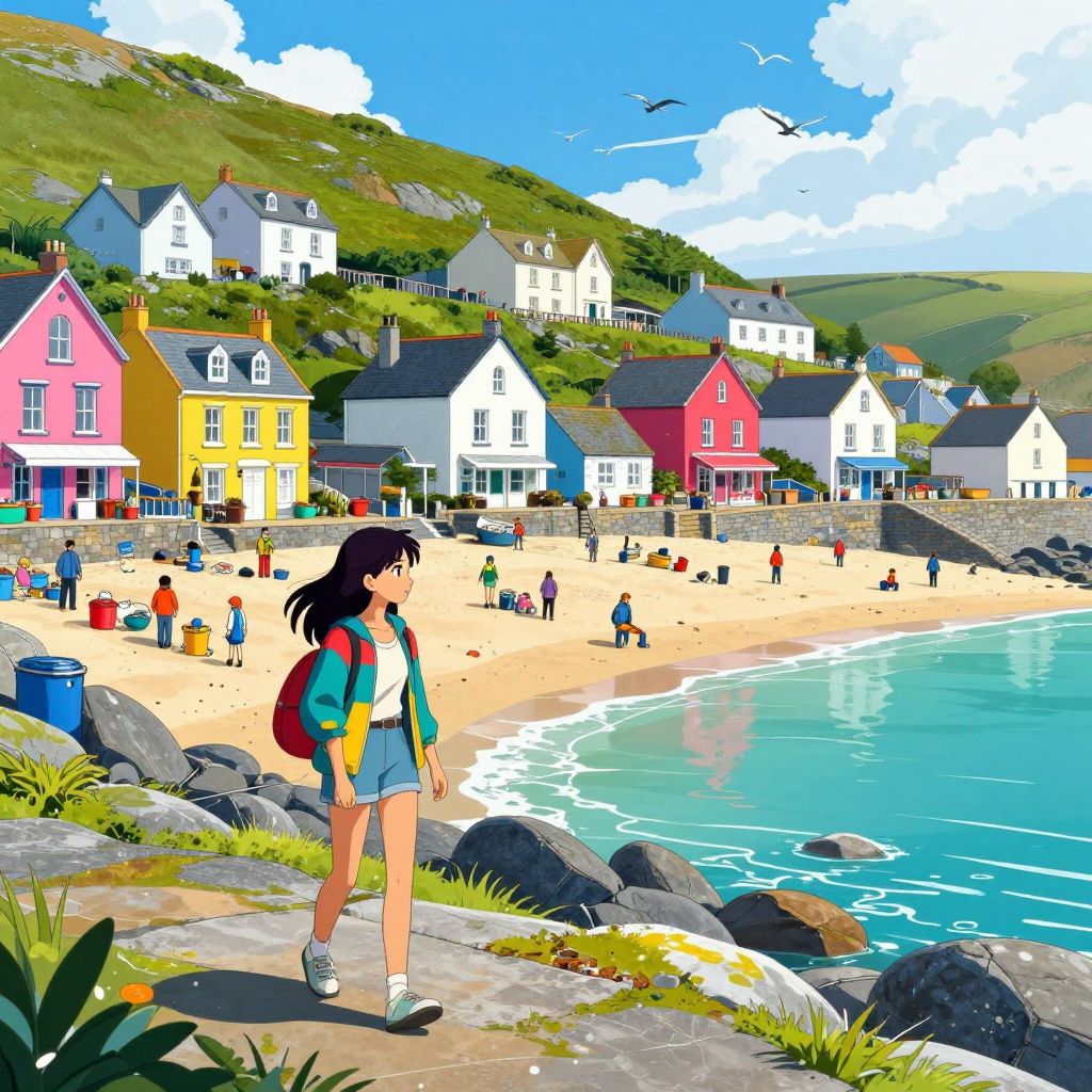 In this vibrant and colorful anime-style illustration, a young woman with long hair is walking through a picturesque beachside fishing village in Cornwall, Glass Beach. The scene is teeming with life and activity, with numerous people scattered throughout the village, engaged in various activities. The buildings, painted in a variety of bright colors, line the streets, creating a lively and inviting atmosphere. The woman, dressed in a colorful jacket and carrying a backpack, is walking along the rocky beach, her reflection visible in the water. The sky above is filled with birds, adding to the sense of movement and energy in the scene. The overall composition is dynamic, with the woman and the village arranged in a way that draws the viewer's eye through the image, from the foreground to the background. The interplay of colors, textures, and shapes creates a sense of depth and realism, making the scene feel both vibrant and serene.
