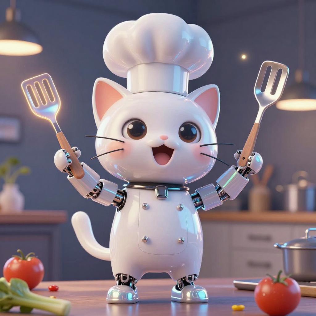 A playful caricature of robotic chef cat juggling glowing kitchen utensils rendered in futuristic digital art with holographic textures, capturing comic energy and creative flair.