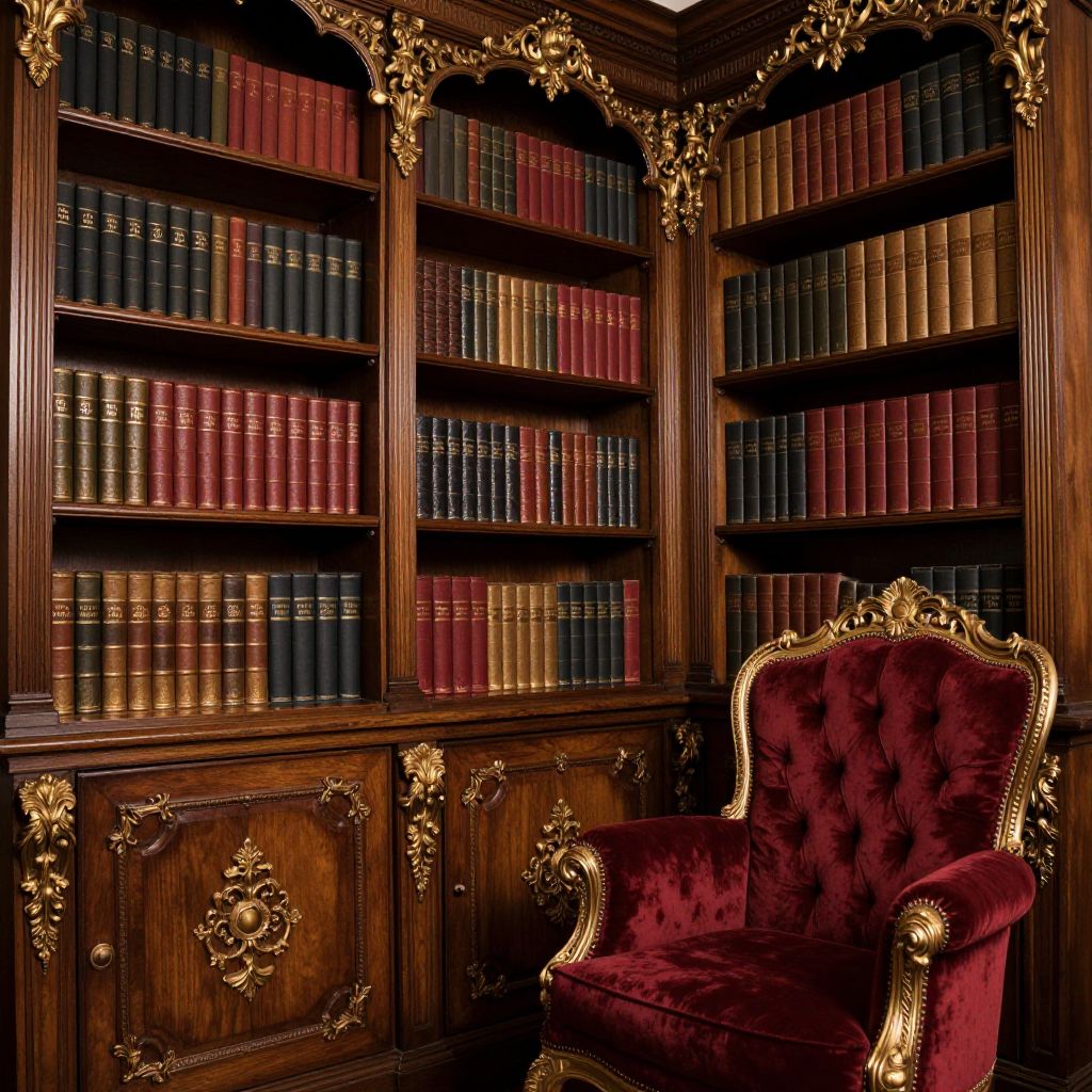 Décor of an elegant Victorian study, ornate wooden bookshelves filled with leather-bound books, intricate gold accents, deep red velvet armchair, soft ambient lighting, rich textures and detailed wood carvings, classic and luxurious ambiance