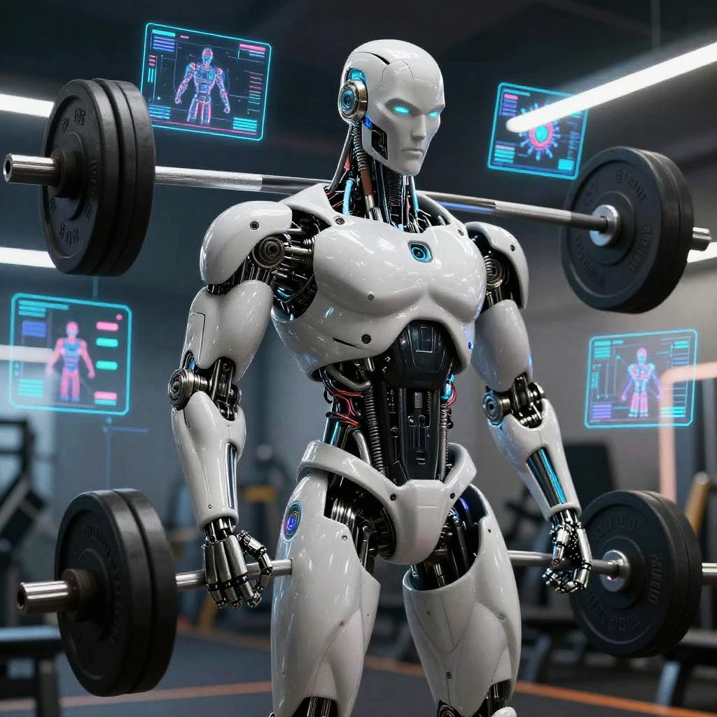 Bodybuilding AI conceptual art featuring a humanoid android lifting heavy weights in a futuristic gym filled with holograms and advanced robotics, combining organic muscle structure with mechanical elements, dramatic lighting and sharp contrast.