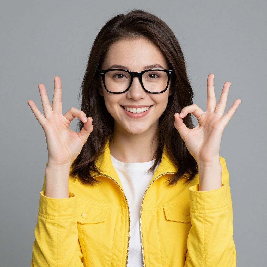 Cheerful young woman wearing black-framed eyeglasses and a vibrant yellow jacket makes an \"OK\" gesture with both hands while smiling brightly at the camera against a neutral gray background.