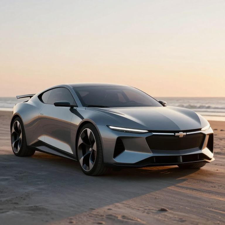 A sleek Chevrolet FNR concept car, rendered in high-definition 3D, showcases a futuristic design with sharp lines and aerodynamic contours, set against a serene beach backdrop during the golden hour, capturing the essence of modern automotive innovation and digital artistry.