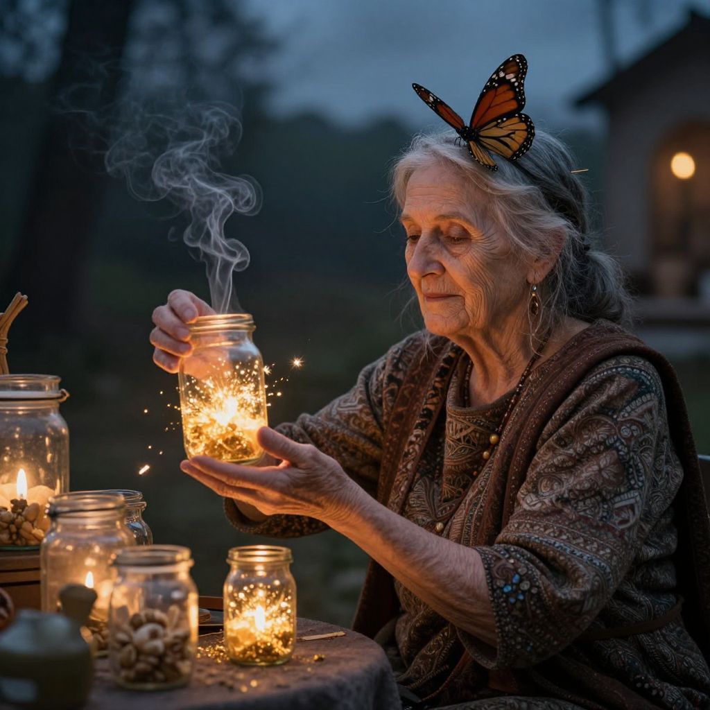 In a hushed sanctuary of twilight and incense, an elderly woman cradles the ephemeral magic of whispered dreams, pouring golden sparks into glass jars that glow with the promise of hope, while a monarch butterfly perched upon her head symbolizes the delicate dance between freedom and the weight of memory.
