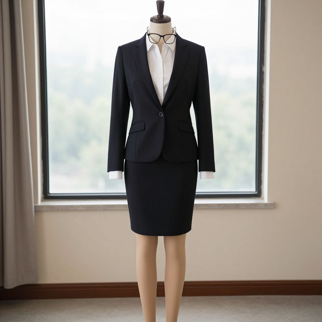 Photograph of a mannequin displaying a black pinstriped blazer and a matching knee-length skirt. The blazer, with two buttons and a white shirt underneath, has long sleeves and a tailored fit. The mannequin, with beige legs, stands in front of a large window with light gray curtains pulled to the sides. The window lets in bright natural light, creating a soft, neutral background. The floor is carpeted in a light beige color, and the baseboard is dark brown. The mannequin's head is a black stand with a small finial on top.
