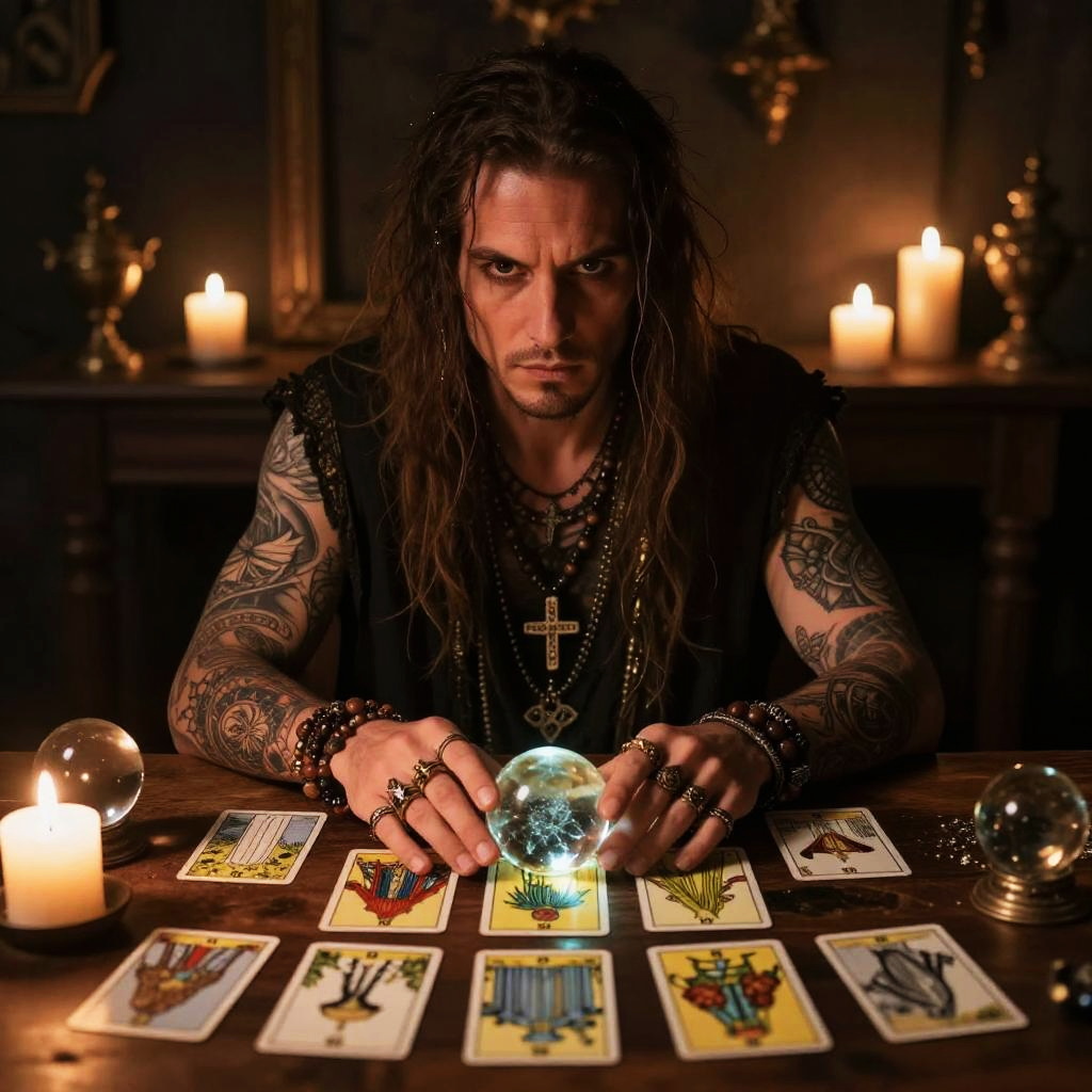 Gypsy male fortune teller sitting at a wooden table covered with tarot cards and crystal balls, intricate tattoos visible on his arms, warm candlelight illuminating his intense gaze, dark and moody ambiance, photo-realistic