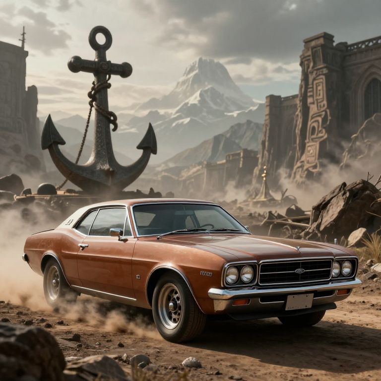 Anchor Point mythology, old god:: in the style of a ford pinto car, representing all the glory of the pinto, in an epic landscape,