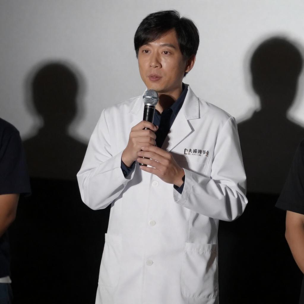 Photograph of a man in a white lab coat holding a microphone, standing in a dimly lit room with bright light behind him. Another person is partially visible on the right. Intense light creates strong shadows. Two people.