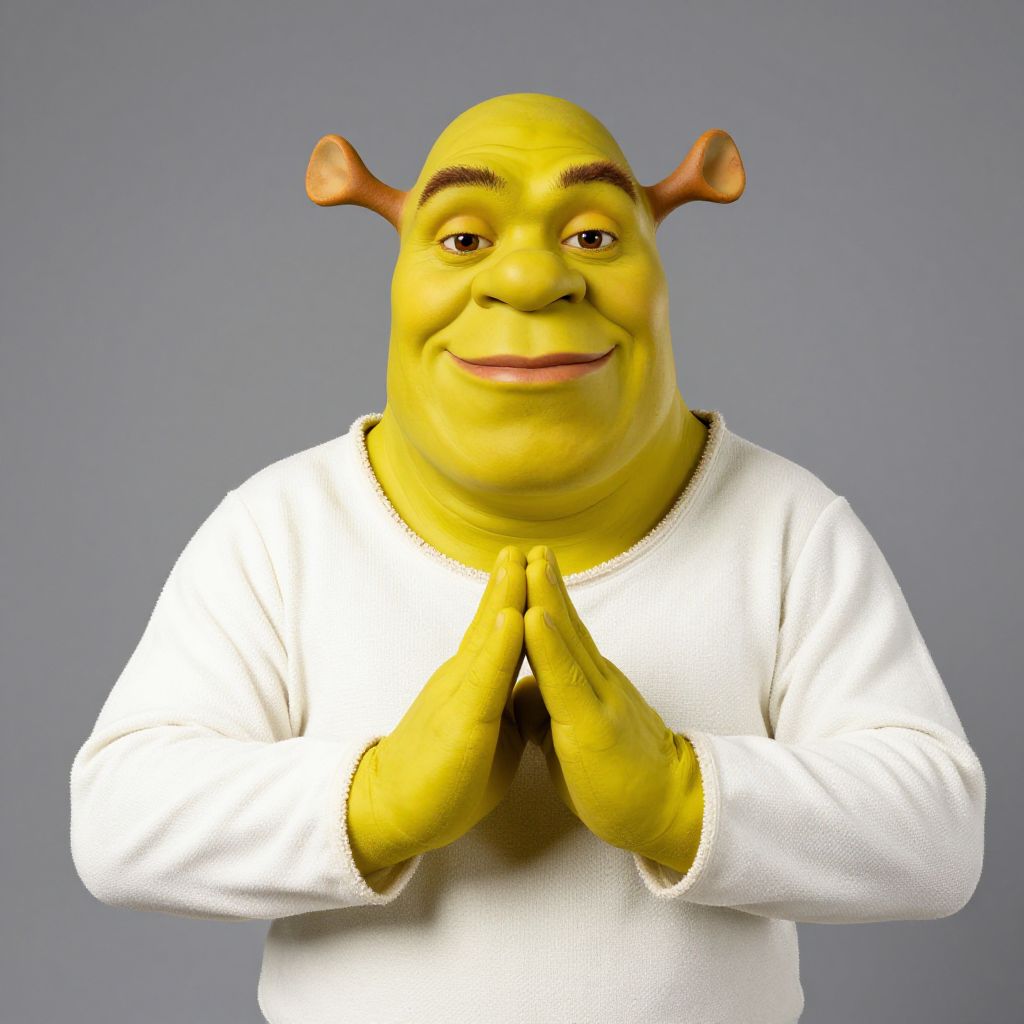 Fancy dress shrek character, yellow skin, solo, male focus, 1boy, colored skin, grey background, looking at viewer, own hands together, alien, smile, simple background, closed mouth, long sleeves, white shirt, brown hair, shirt
