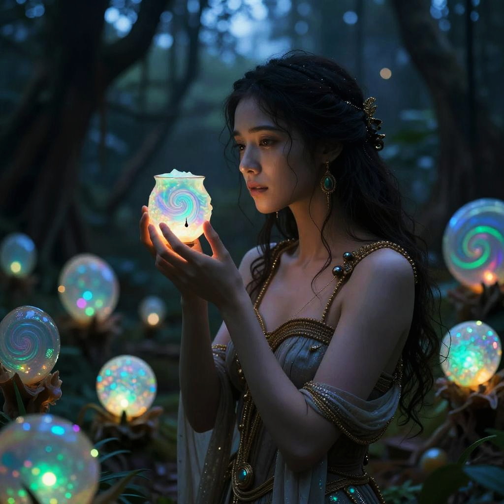 A portrait of a young Asian woman dressed in flowing, enchanting robes holding a magical staff emitting sparkles and swirling energy. The scene is illuminated with cinematic rim and side lighting highlighting delicate details of her skin, hair, and intricate clothing texture. The background suggests a mystical forest setting with faint magical creatures in shadow.