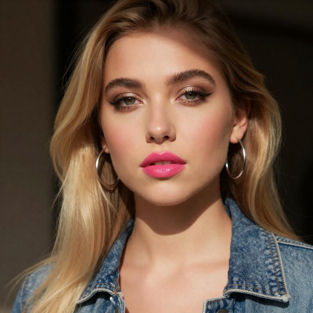 Photograph of a blonde woman with bangs, wearing a strapless black dress, standing with one arm raised behind her head. She has fair skin and intense gaze. A guitar with a colorful pattern is partially visible to her right. Warm, reddish lighting.