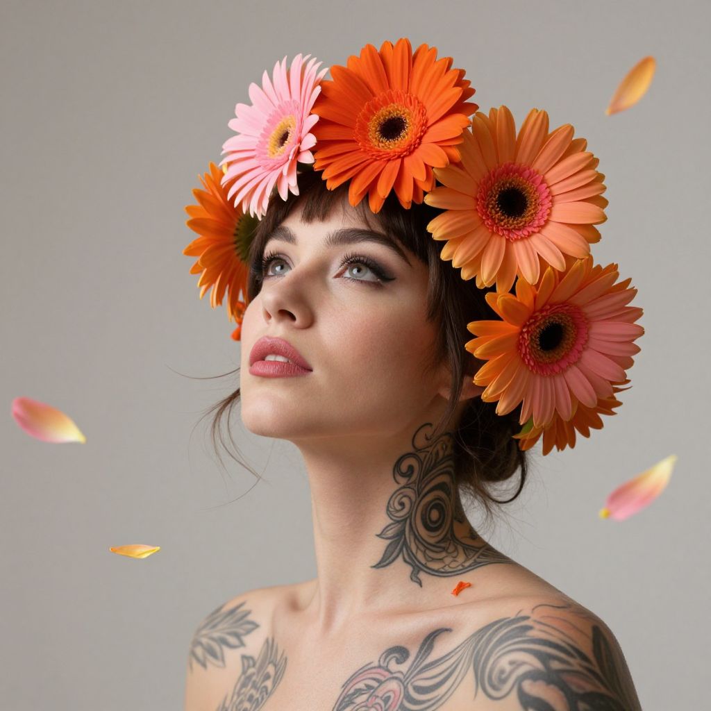 A woman adorned with vibrant orange and pink gerbera daisies crowning her head gazes upward, surrounded by floating petals that seem to dance around her, while intricate tattoos embellish her neck and shoulders against a soft, neutral background.