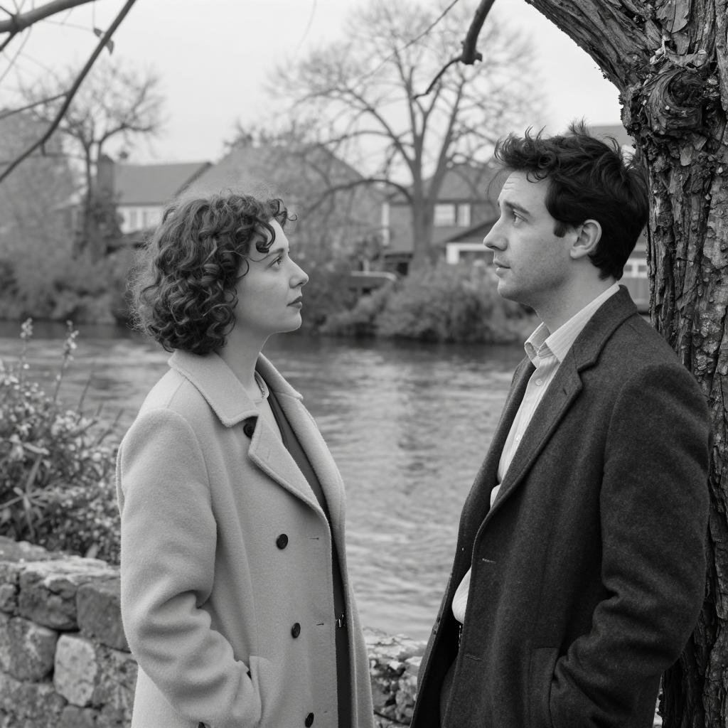 Black-and-white photograph of two men standing in front of a metal fence. Man on left wears plaid shirt, hands in pockets, looking at man on right. Man on right wears dark suit, fedora, facing left, intense expression. Fence with vertical bars in background. Overcast sky. Both men have short hair.