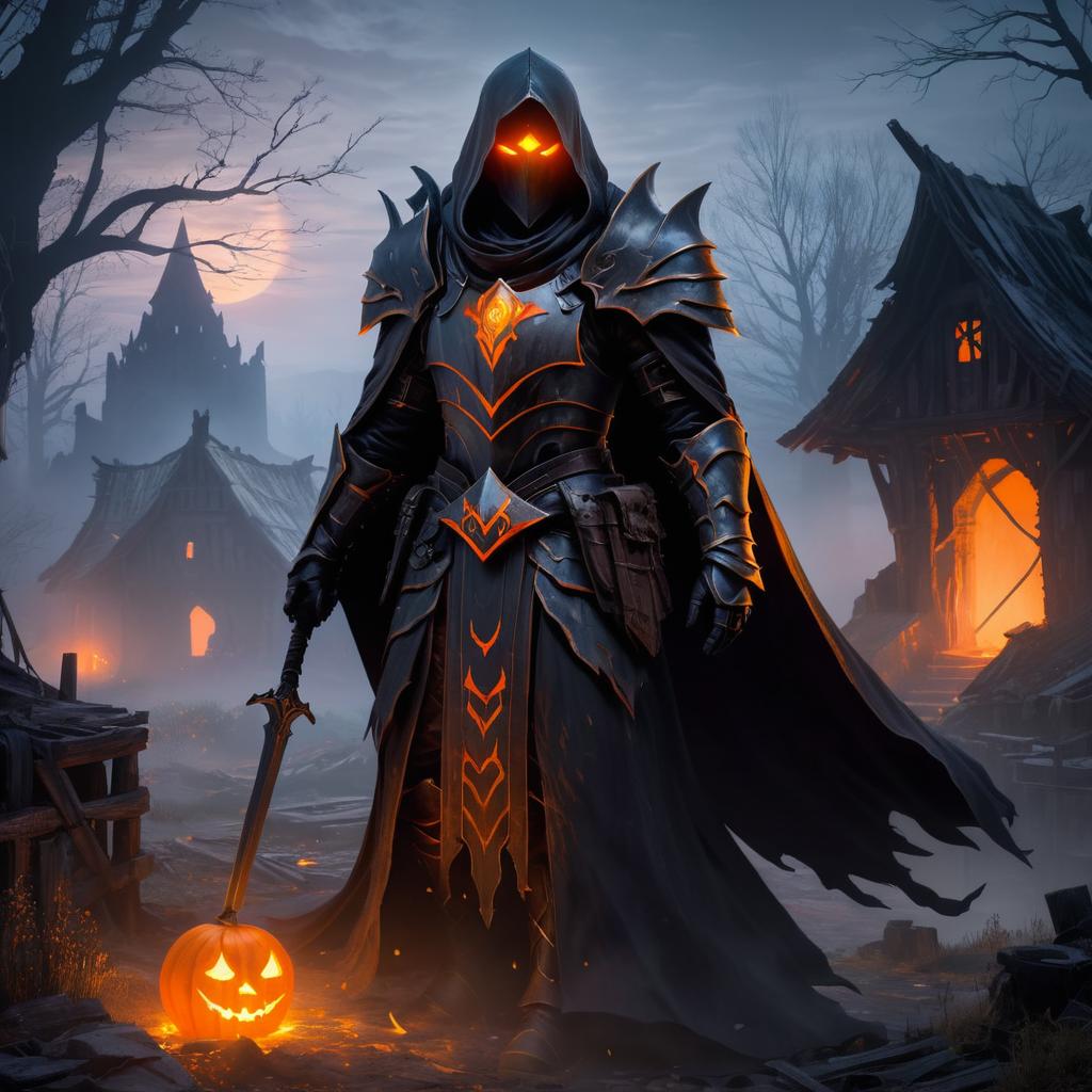 A dark, menacing hooded warrior clad in detailed black armor with glowing orange accents stands in a foggy, eerie village at sunset. The warrior has fiery glowing eyes and holds two glowing jack-o'-lanterns, with old wooden houses and barren trees in the background, creating a spooky, fantasy Halloween scene.