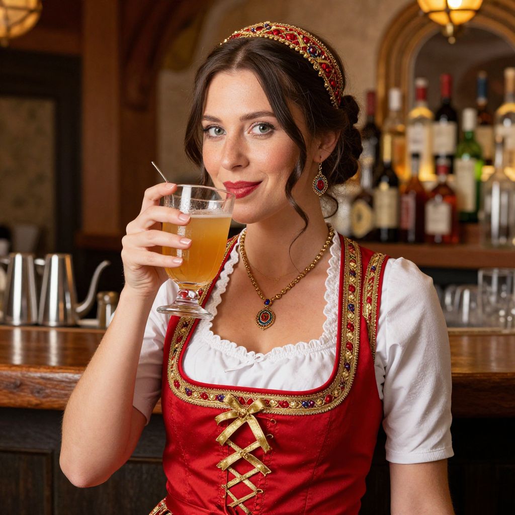 Woman dressed in vibrant traditional attire sips a golden cocktail while smiling warmly, her ensemble featuring a red dirndl with intricate gold trim, complemented by matching accessories including a headpiece, necklace, and earrings, set against a cozy bar backdrop filled with bottles and warm lighting.
