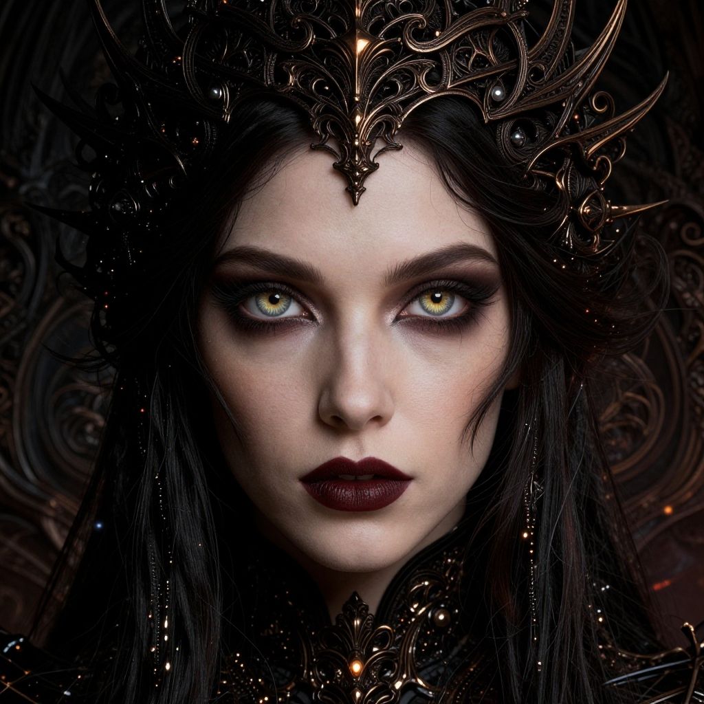 Photograph of a pale-skinned woman with striking blue eyes and dark, wet, shoulder-length hair. She has bold, dark eyebrows, dramatic eye makeup, and vivid red lipstick. Her ethereal, translucent wings, adorned with sparkling, multicolored lights, are illuminated against a dark, gradient background. The image has a fantasy, otherworldly feel, with a focus on her intense gaze and contrasting makeup. The lighting emphasizes her facial features and the shimmering texture of her wings. The overall style is dramatic and magical, with a high-fashion, editorial aesthetic.
