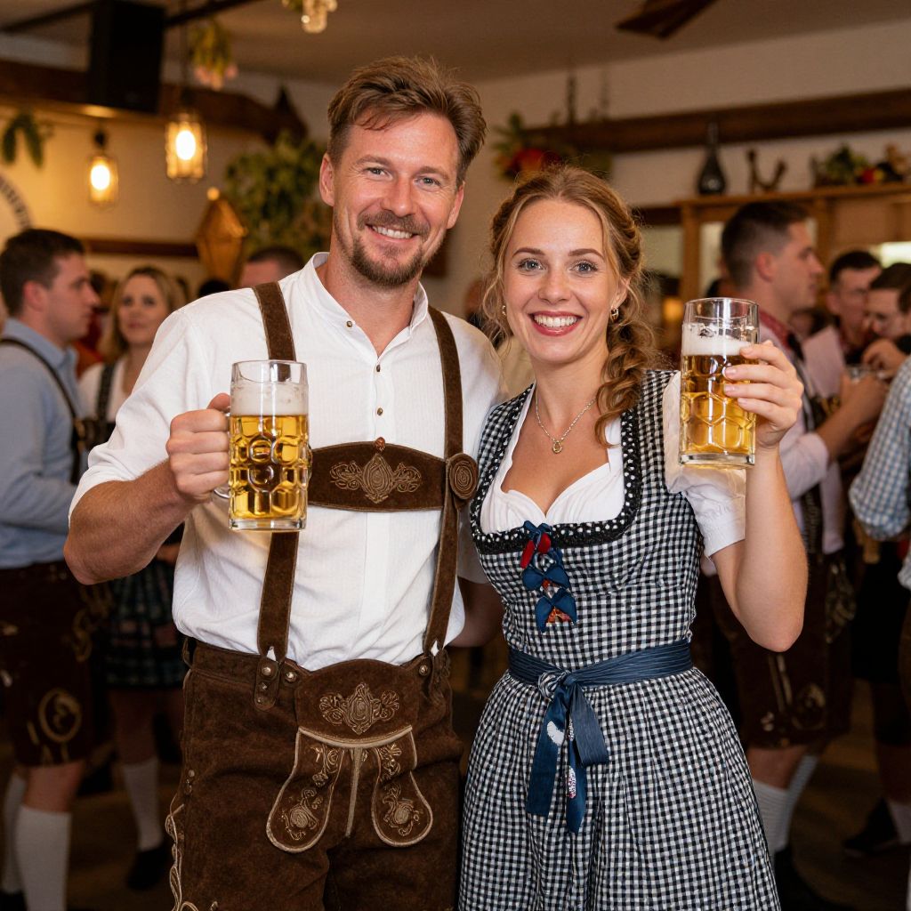 Two individuals dressed in traditional Oktoberfest attire—a man in a white shirt, brown lederhosen, and suspenders, and a woman in a black-and-white checkered dirndl—pose joyfully while holding glasses of beer, surrounded by a festive crowd in a warmly lit indoor setting.