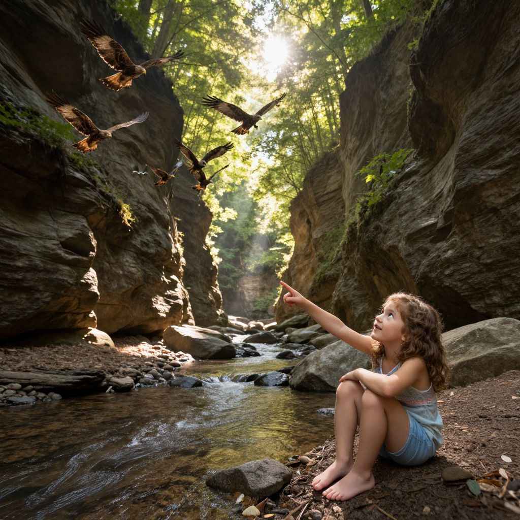A serene time-lapse-style image capturing the transformation of a forested canyon from sunrise to noon, showing sunlight breaking through the canopy, casting shifting patterns of light across the canyon floor. A barefoot child with curly brown hair and bright eyes sits near a small stream, pointing at a flock of red-tailed hawks circling above, her face full of joy and awe.