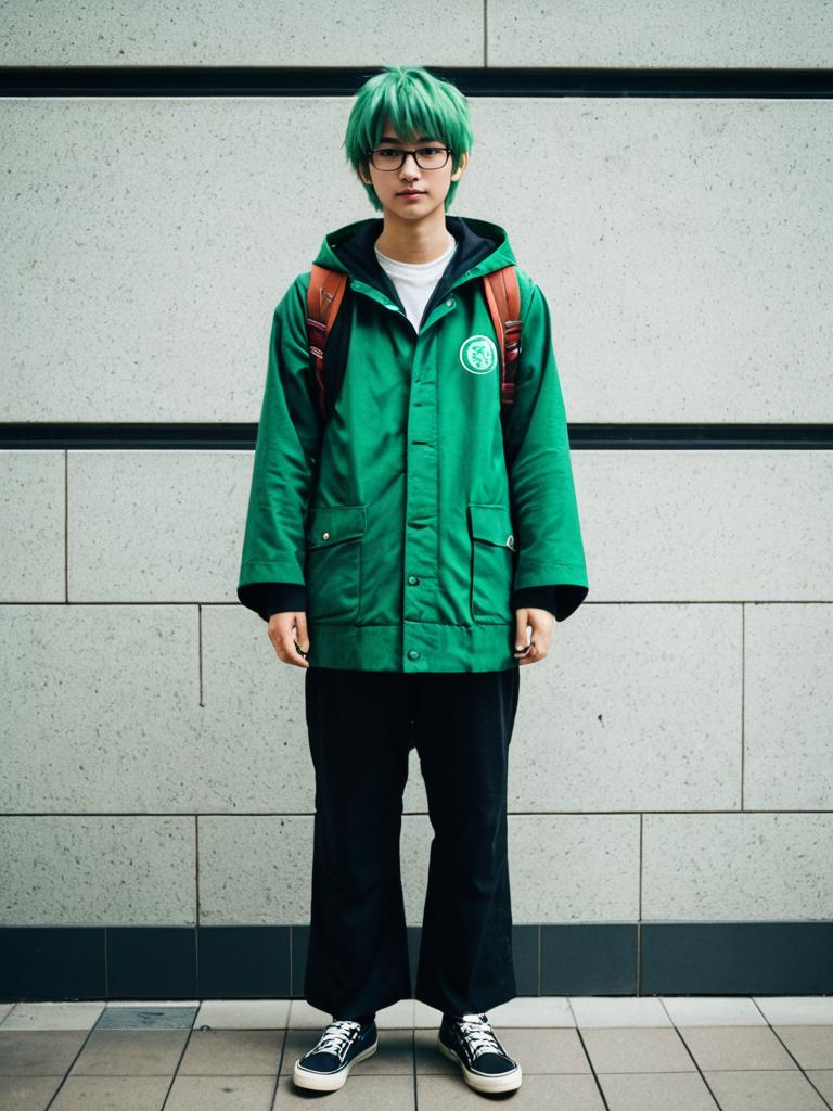 Full body photo of a cosplayer with green hair wearing glasses, a green and black jacket with long sleeves, black pants, and black sneakers. The person is standing against a tiled wall background, wearing a backpack, and styled with a modern urban look.