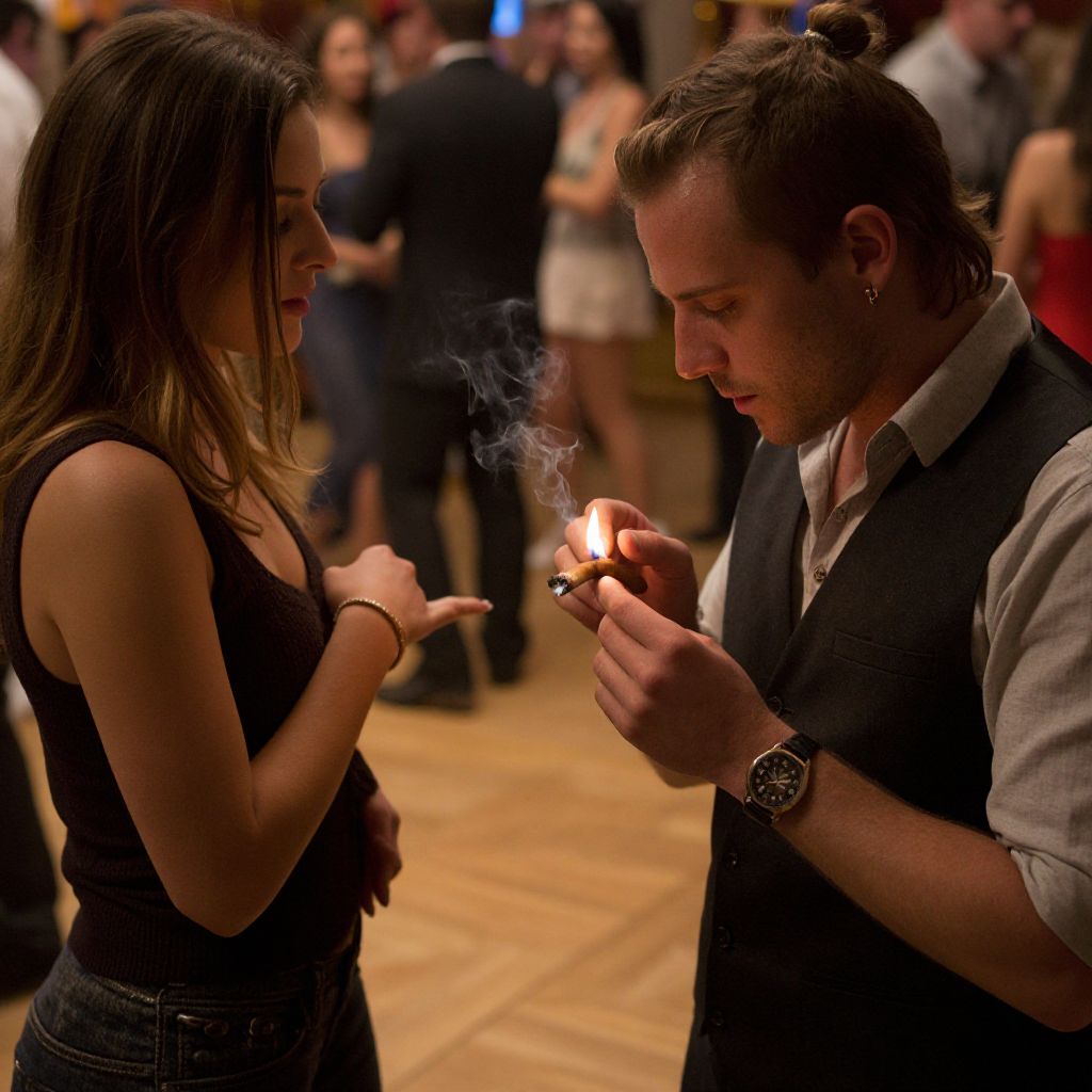Photograph of a dimly-lit social event. A tall, slim woman with long brown hair, wearing a black sleeveless top and blue jeans, stands to the left, smiling and pointing at a lit cigarette held by a tall, handsome man with light brown hair tied in a bun, wearing a white shirt and black vest. The cigarette emits a small plume of smoke. The background is blurred, showing other attendees in casual attire, standing and conversing. The floor is wooden, and the overall scene has a warm, intimate atmosphere. The man's wristwatch is visible, adding a touch of elegance.