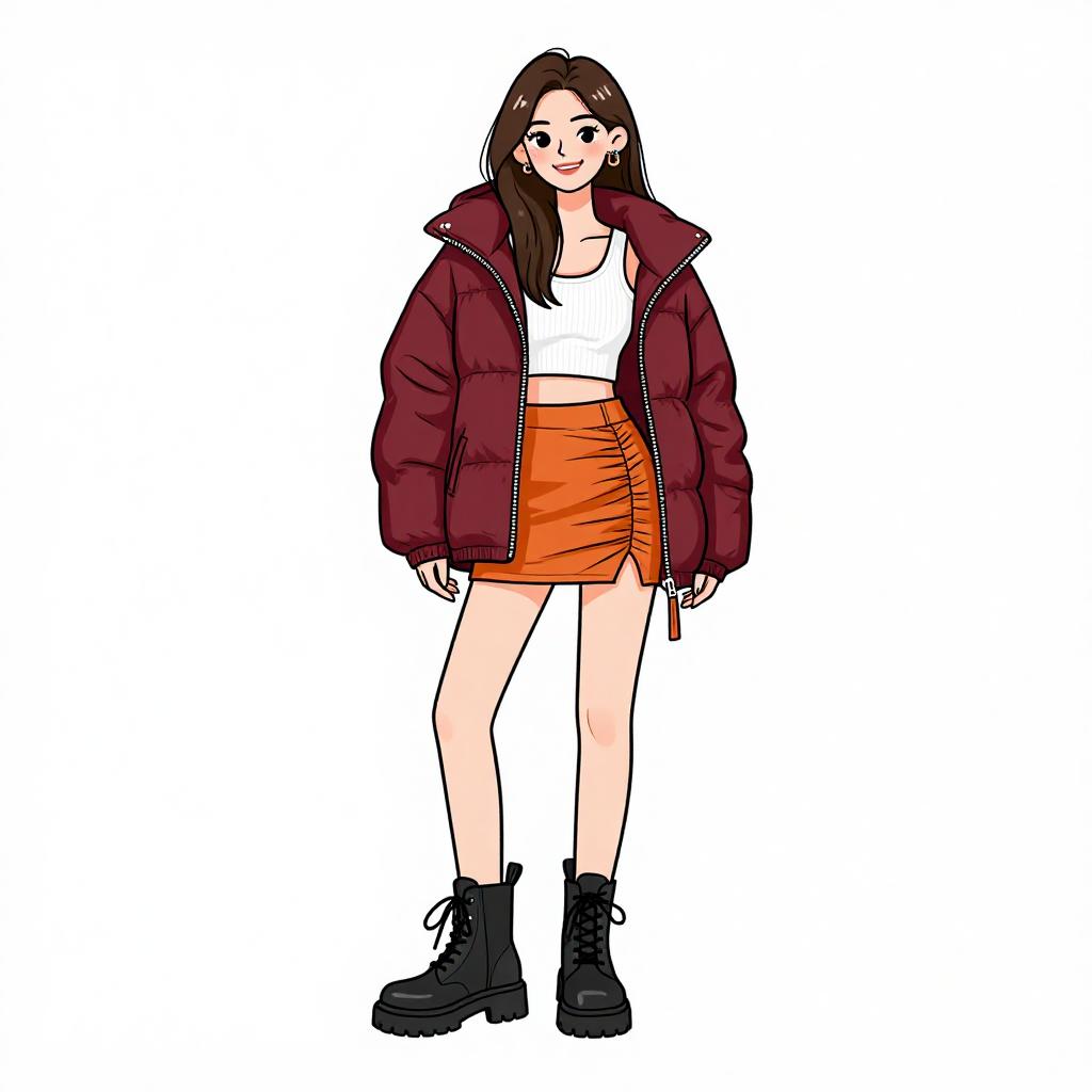 Woman with pretty face and pretty hair. smiling Woman, casual streetwear, oversized burgundy puffer jacket with hood, white cropped tank top, high-waist burgundy cargo pants, black fanny pack worn across the chest, white and black sneakers, neutral studio background. --sref 1467
