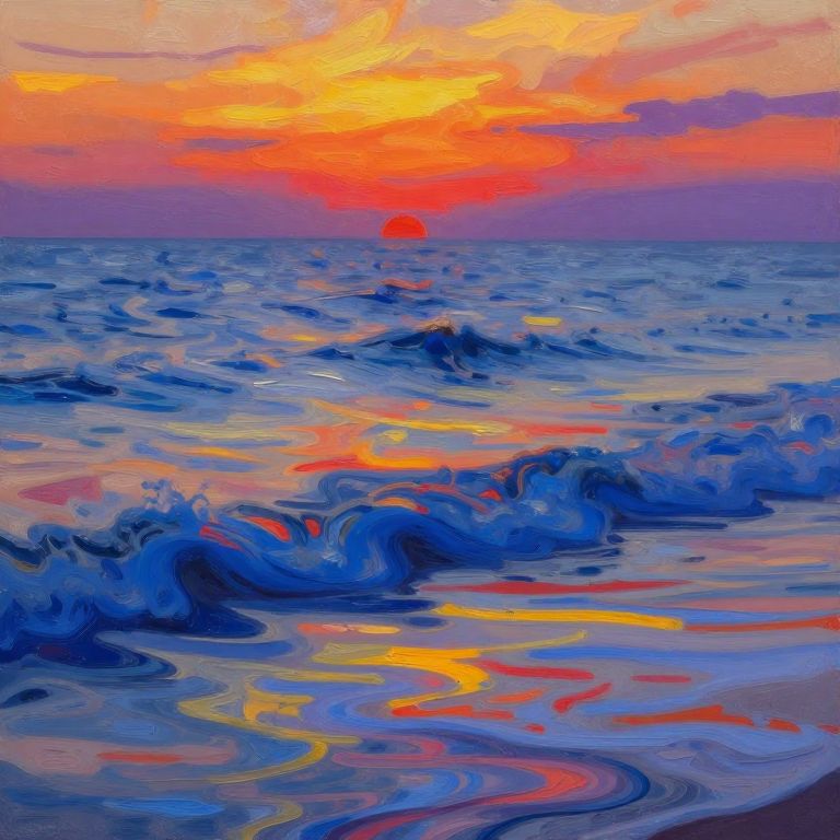 Sunset colorful ocean waves depicted in an impressionistic style, swirling patterns of blues, reds, and yellows blending harmoniously, vibrant sky transitioning from fiery orange to twilight purple, evoking a dreamy and artistic seaside ambiance.