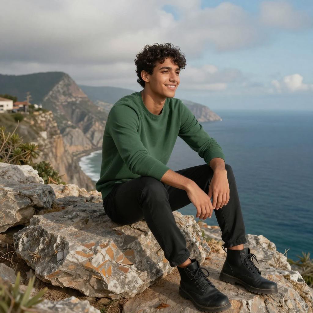 Photograph of a young man with light brown skin and short, dark curly hair, sitting on a rocky cliff. He's wearing a green long-sleeve shirt, black pants, and black boots. He's smiling and looking off to the side. The background shows a stunning view of a coastal landscape with mountains, a blue ocean, and cloudy sky. The light is soft, casting gentle shadows.