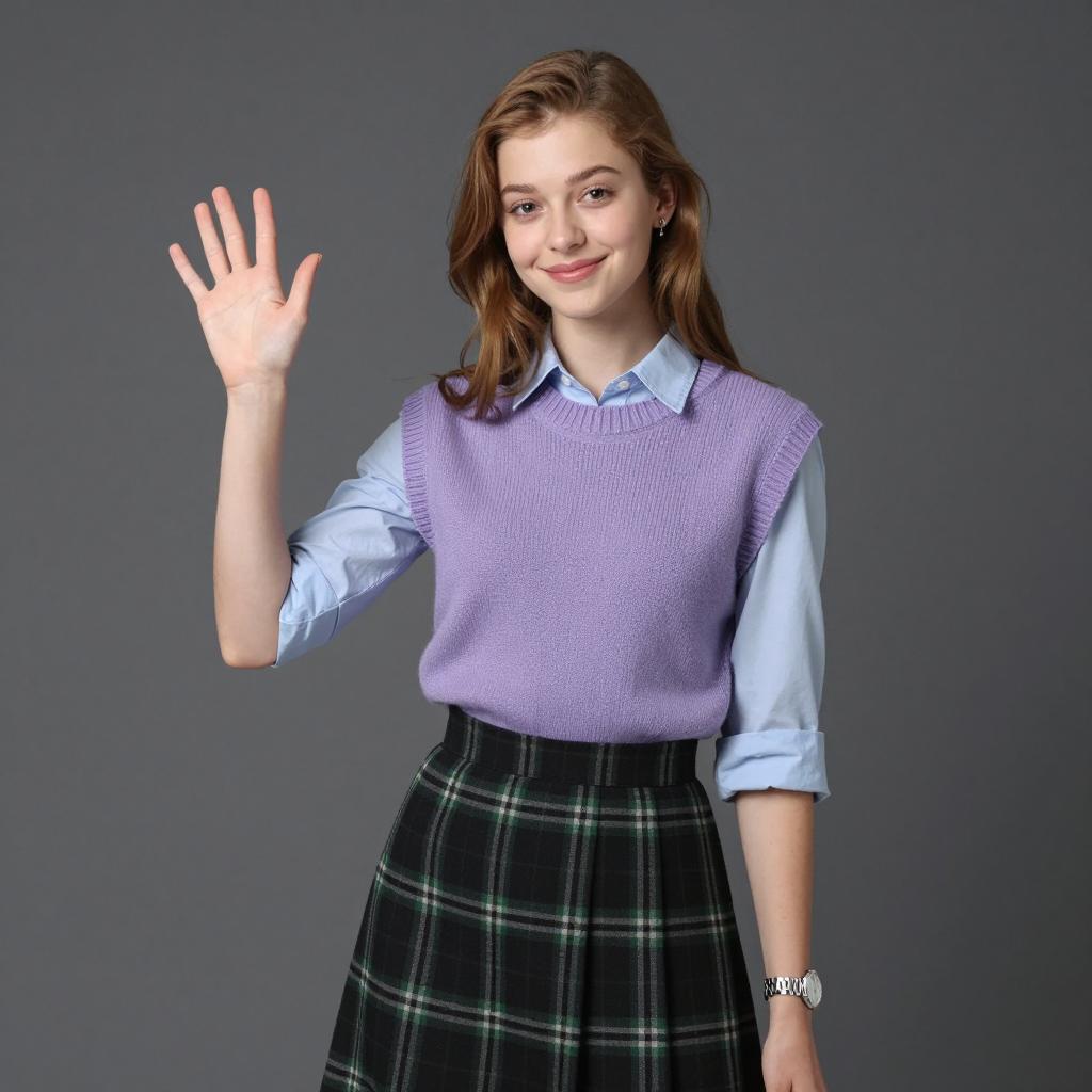 Young woman with light brown hair, smiling, waving with right hand. Wearing light blue shirt, purple knit sweater, black and green plaid skirt. Standing against plain dark gray background. Right wrist has silver watch. Casual pose, light skin.