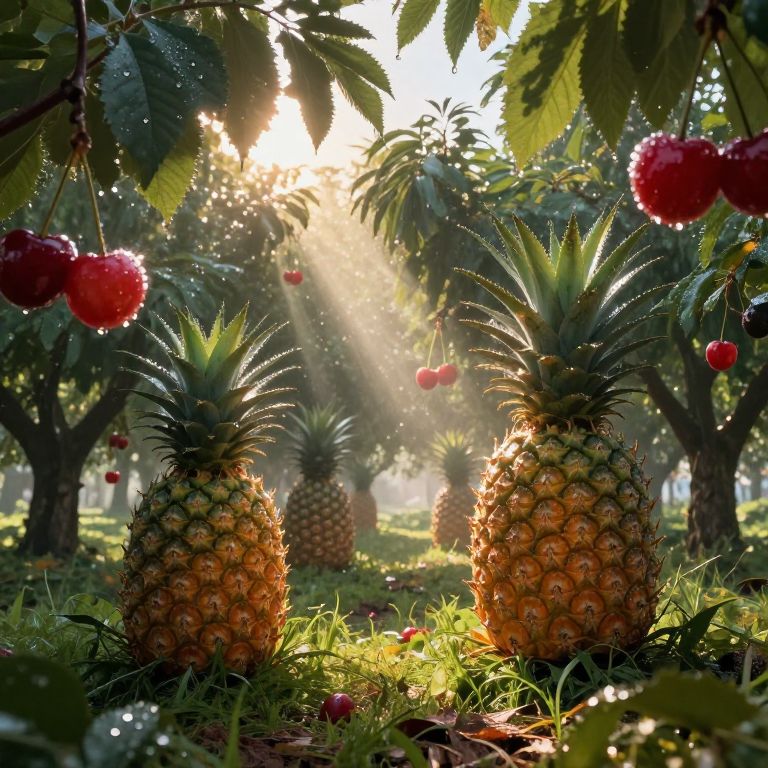 Frutopia at dawn, showing a surreal orchard of towering pineapples and cherries, with sparkling dew drops and magical light beams filtering through fruit leaves, highly imaginative and detailed, fantasy concept art